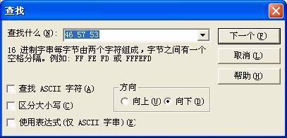 搜索結果如圖二。注意看“46 57 53”三個字節后面的五個字節,即“08 92 46 00 00”(不同Flash由于文件大小和版本不同,五個字節的實際值不可能和這里完全一樣)。這五個字節有特定的意義:第一個表示Flash版本號,后四個表示該Flash文件的大小。特別要提醒的是:這里的數值是以十六進制計算的而且是倒序排列的,即文件大小是十六進制的00004692(下面計算時0000要省略)。用操作系統中自帶的“計算器”軟件把十六進制的“4692”換算成十進制等于“18066”。現在,回到UltraEdit-32中用鼠標選中從“46 57 53”開始向下的18066字節大小區間并復制(UltraEdit-32的狀態欄中可以直接看到選定大小,如圖三)。