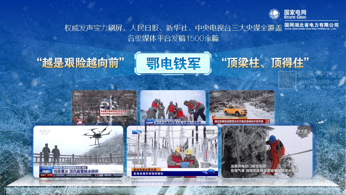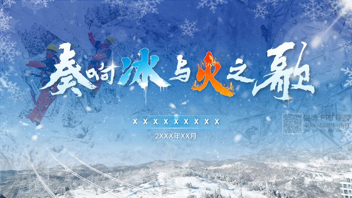 PPT標題 “冰” 字藍色、“火” 字橙色,冷暖對比強烈,既展現冰天雪地與火熱工作激情的碰撞,又吸引視覺,傳達國網湖北電力不畏艱難、守護電力的精神。