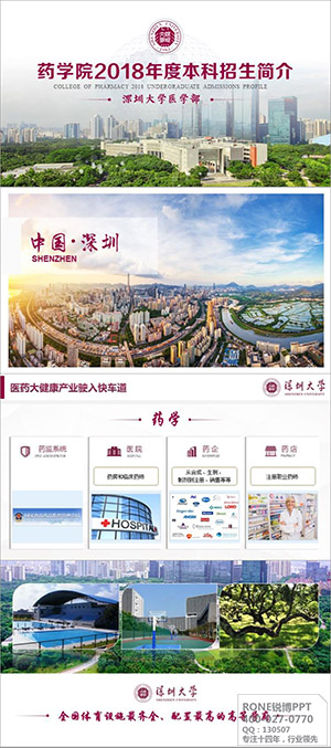 深圳大學 醫學院的招生宣傳PPT 需要展示校園風貌,體現文化底蘊,在時代中體現前瞻性。這些我們充分的體會考慮到,收集相關資料,查閱有關書籍報道。根據其自身特點,配色上嚴謹而不失朝氣,大氣統一,無不體現校園風采。