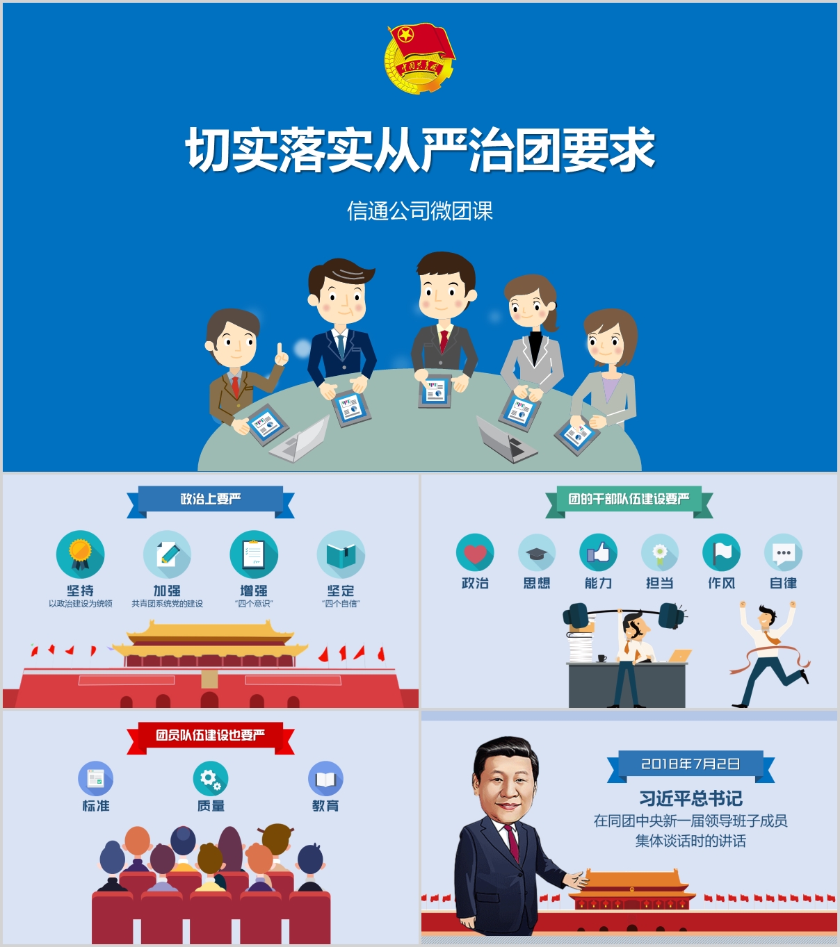 整體采用歡快活潑的卡通素材來表達主題思想。卡通人物的使用契合每頁所要表達的內容,天安門和習大大彰顯著要堅持黨的領導,緊跟黨的步伐,顏色的搭配讓整體看起來顯得沉穩,簡潔的文字配上精美的小圖標更顯檔次。