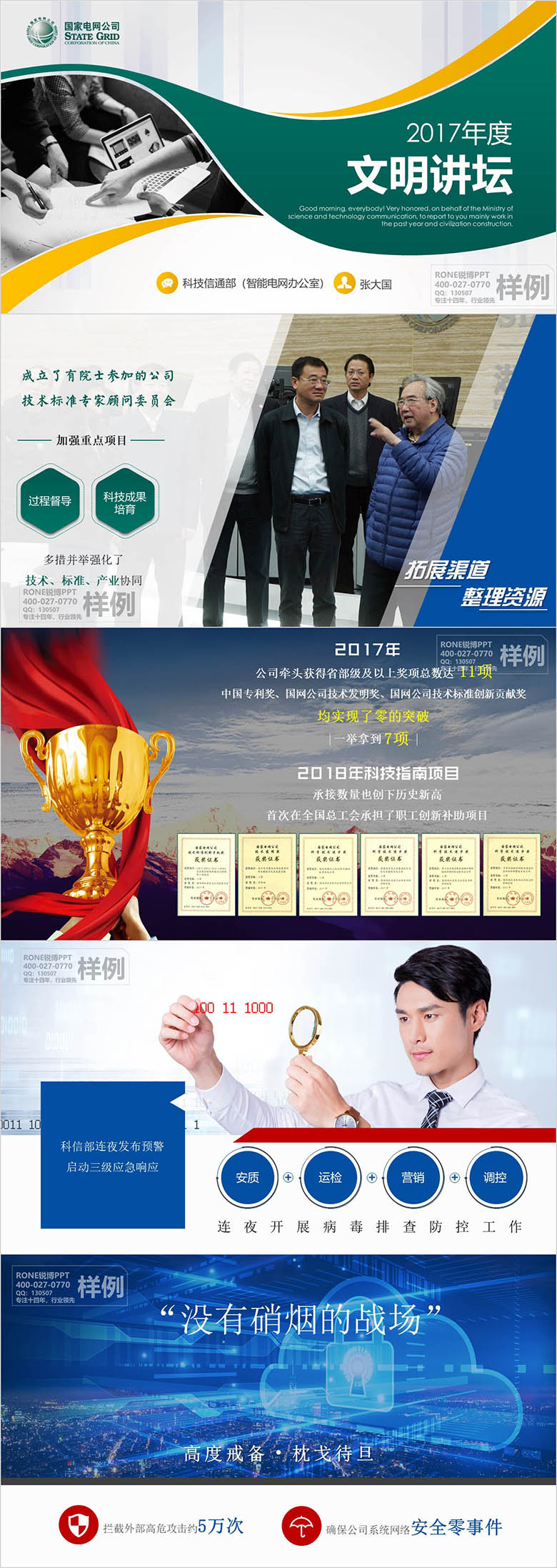 此項目是為湖北電網公司科信部所制作的的演講演示PPT,考慮其主題為智能電網,整體以藍色調為主,搭配大氣科技底圖,兼顧酷炫動畫,前后遙相呼應,點亮了“智能”這一主題
