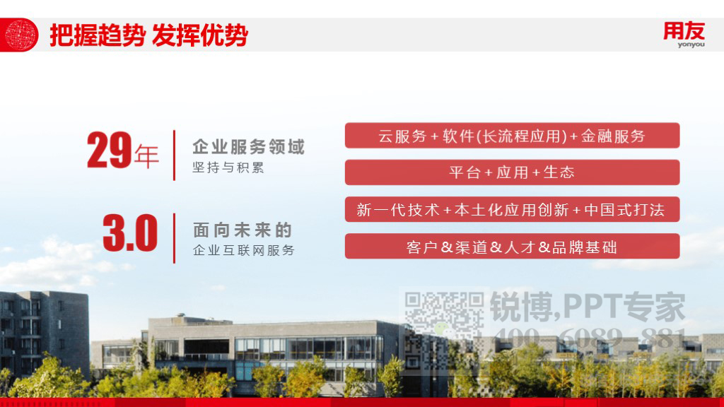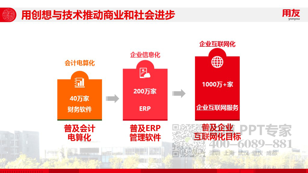 — 說(shuō)明:由于用友的企業(yè)形象設(shè)計(jì)中采用的是橙紅色,為了達(dá)到統(tǒng)一視覺(jué)符合用戶企業(yè)文化的效果PPT最終也采用了橙紅色為主調(diào)。大量的信息在經(jīng)過(guò)簡(jiǎn)化后通過(guò)圖表化的設(shè)計(jì)手法,化繁為簡(jiǎn)突出重點(diǎn),高效的傳達(dá)信息。