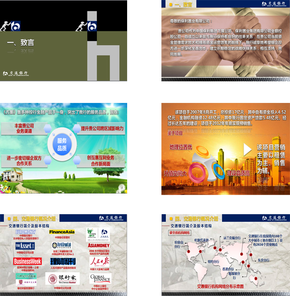 案例介紹: PPT采用立體生動(dòng)效果,跟該集團(tuán)的經(jīng)營(yíng)業(yè)務(wù)和企業(yè)文化比較吻合;同時(shí),襯以時(shí)尚藍(lán),避免畫面過于沉悶和保守;PPT的導(dǎo)航系統(tǒng)盡量做出創(chuàng)意,同時(shí)保證PPT的邏輯清晰和嚴(yán)謹(jǐn);動(dòng)畫以簡(jiǎn)約、順暢和創(chuàng)意為主,不雜亂、不瑣碎。本PPT與隨后的視頻宣傳片相互補(bǔ)充,有助于活動(dòng)目標(biāo)的順利實(shí)施。