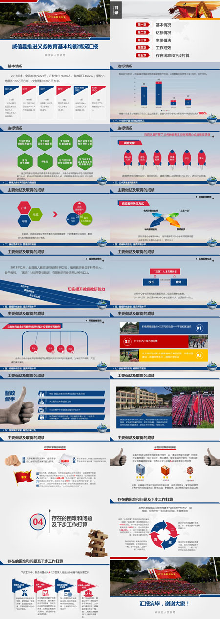 威信縣推進義務教育匯報各地教育基本均衡情況。銳博PPT設計公司為其量身打造評估工作匯報,內容完整設計精美。