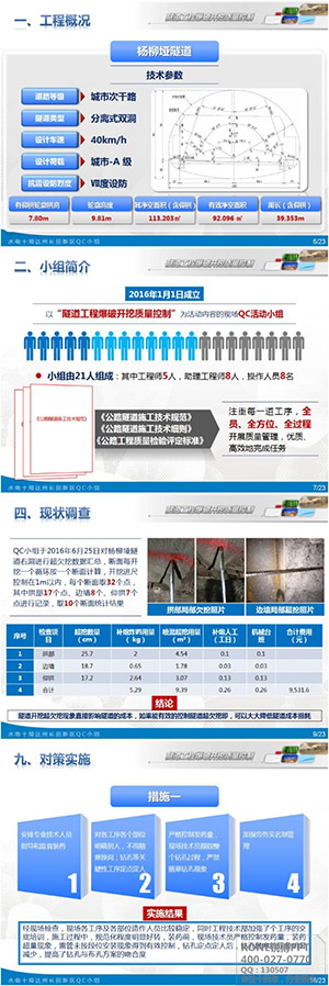 隧道工程是隧洞采用鉆爆法施工,周邊眼采用光面爆破技術,掏槽眼采用鍥型。此版以藍色為主色調,整個畫面色調一致,更生動的體現出隧道工程的嚴謹性和對質量控制把關的重要性。整個框架結構的排版也非常的整齊大氣,給觀看者一種視覺的享受。