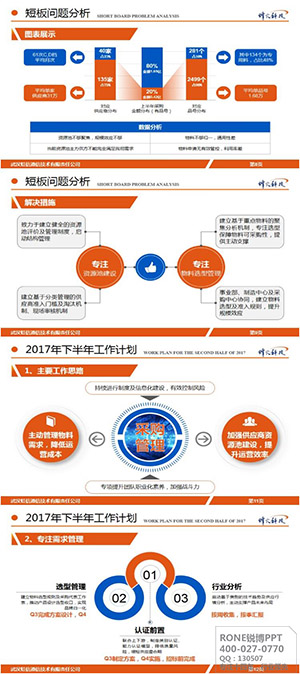 此版以藍色、橙色的色彩搭配,雖然顏色不多,但整體給人一種大氣、美觀的視覺效果。在文字排版上看讓觀看者一目了然,條理清晰,表明了分析匯報這個主題,和對2017年下半年的明確計劃。