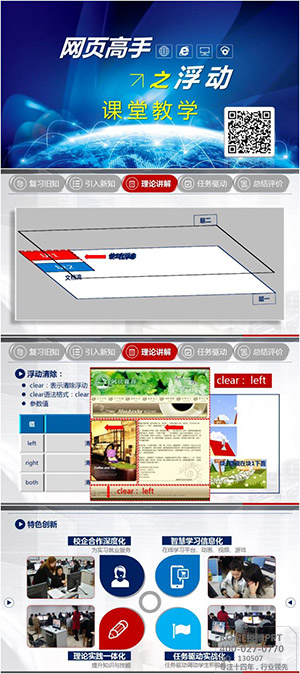 此版以紅色和藍色的冷暖搭配更讓觀看者眼前一亮的觀看體驗,背景呈現的灰色調更突出了重點文字內容,再加上適合的圖片渲染更體現了該課堂的特色和創新。