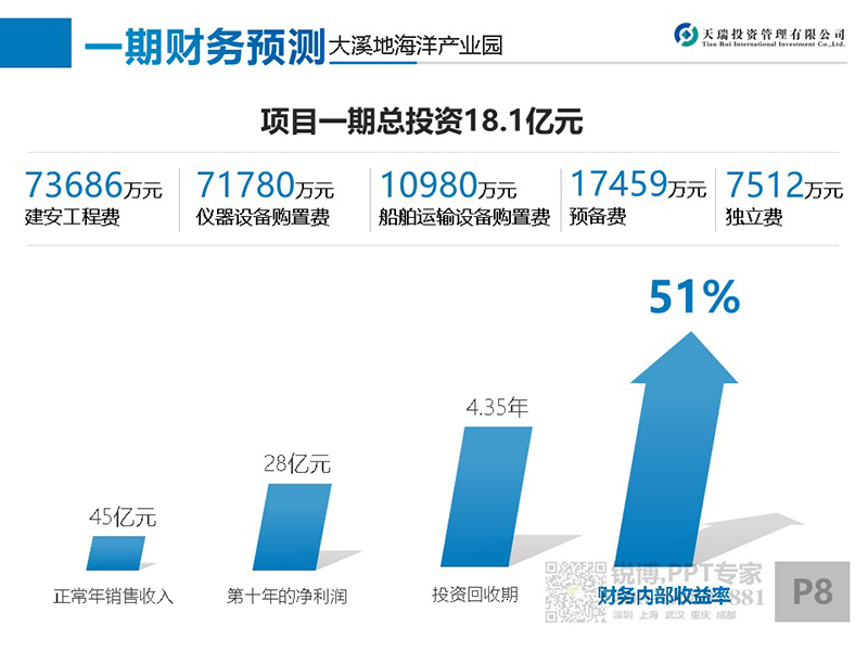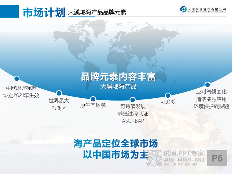 PPT以藍色為主色調,搭配白底使頁面看起來干凈清透,使人聯想到大海。