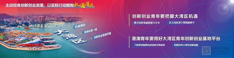 ppt以紅色作為主題色彩,與粵港澳大灣區的活力和熱情相呼應,金色字體作為輔助,增添奢華感和專業度,搭配粵港澳大灣區的場景圖,
