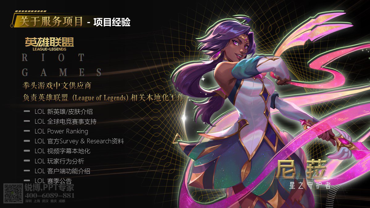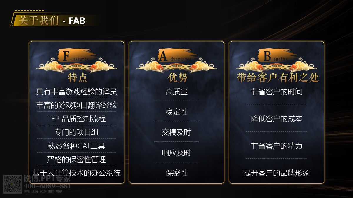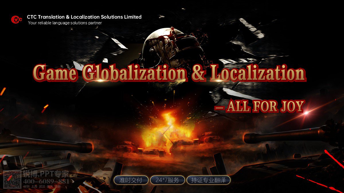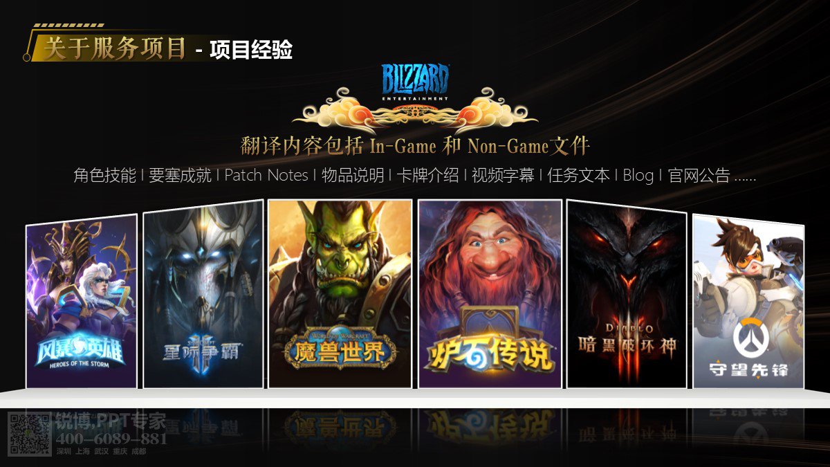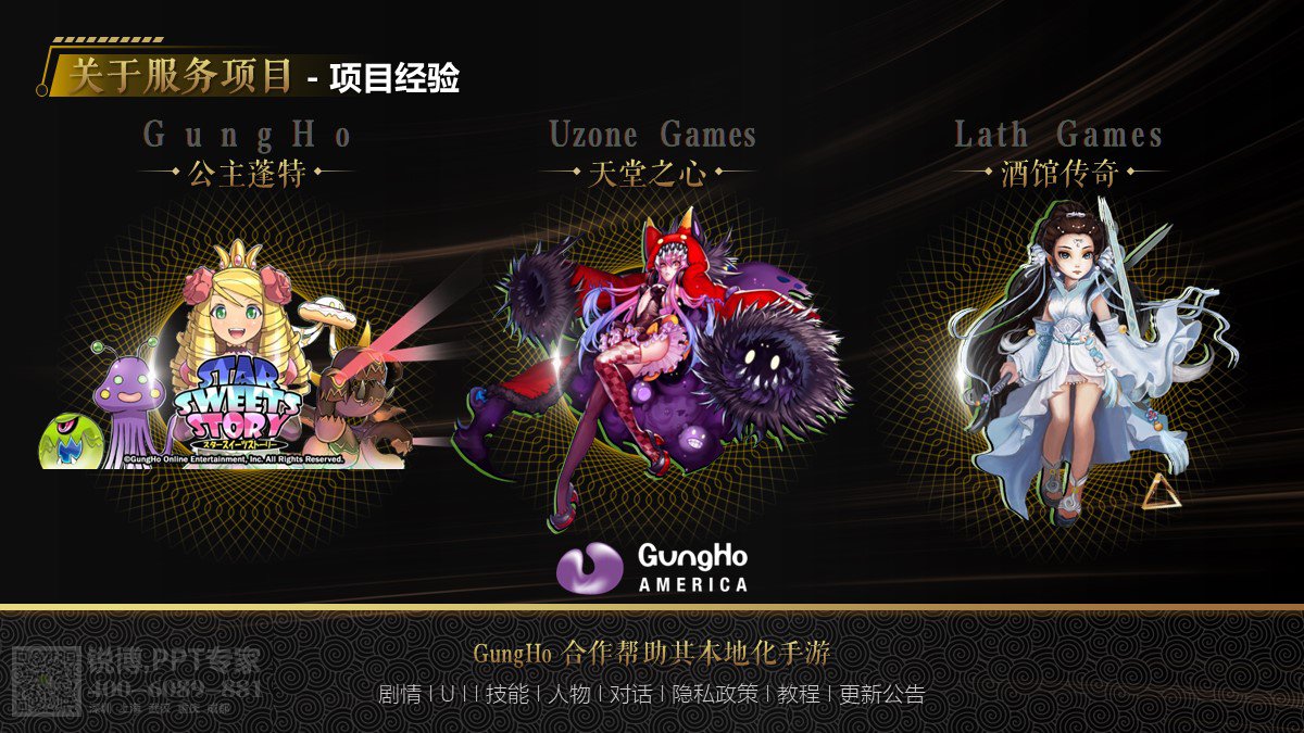 版式上突出主題,用分欄展示。設計風格偏暗黑酷炫,結合游戲元素,契合游戲全球化與本地化業務,彰顯專業可靠的服務形象。